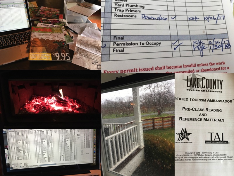 January was quieter and I did get quite a few projects done. I read and digested all my farming notes from the year, made my spreadsheet lists, put in my seed orders and basically organized the 2018 farm plan to a tee. (This is amusing because the plan is usually good only until about 10 minutes into the season and then, well, let’s just say, whatever happens is, at best, a loose interpretation of the lovely, tidy rows in the spreadsheet.) I read the Sunday paper almost every Sunday, while tending the fireplace and watching football. I did a couple of fun creative projects, got the business and personal paperwork stuff done and studied up to become a Lake County Certified Tourism Ambassador. We did tastings for some of the wineries, introduced ourselves to a few more and finally completed the full build permit on the barn. In the middle of all this, we saw neighbors and friends and invited people we’d wanted to know better around as often as possible. It was a fun a busy month but my pile of books was still sitting there, calling to me!